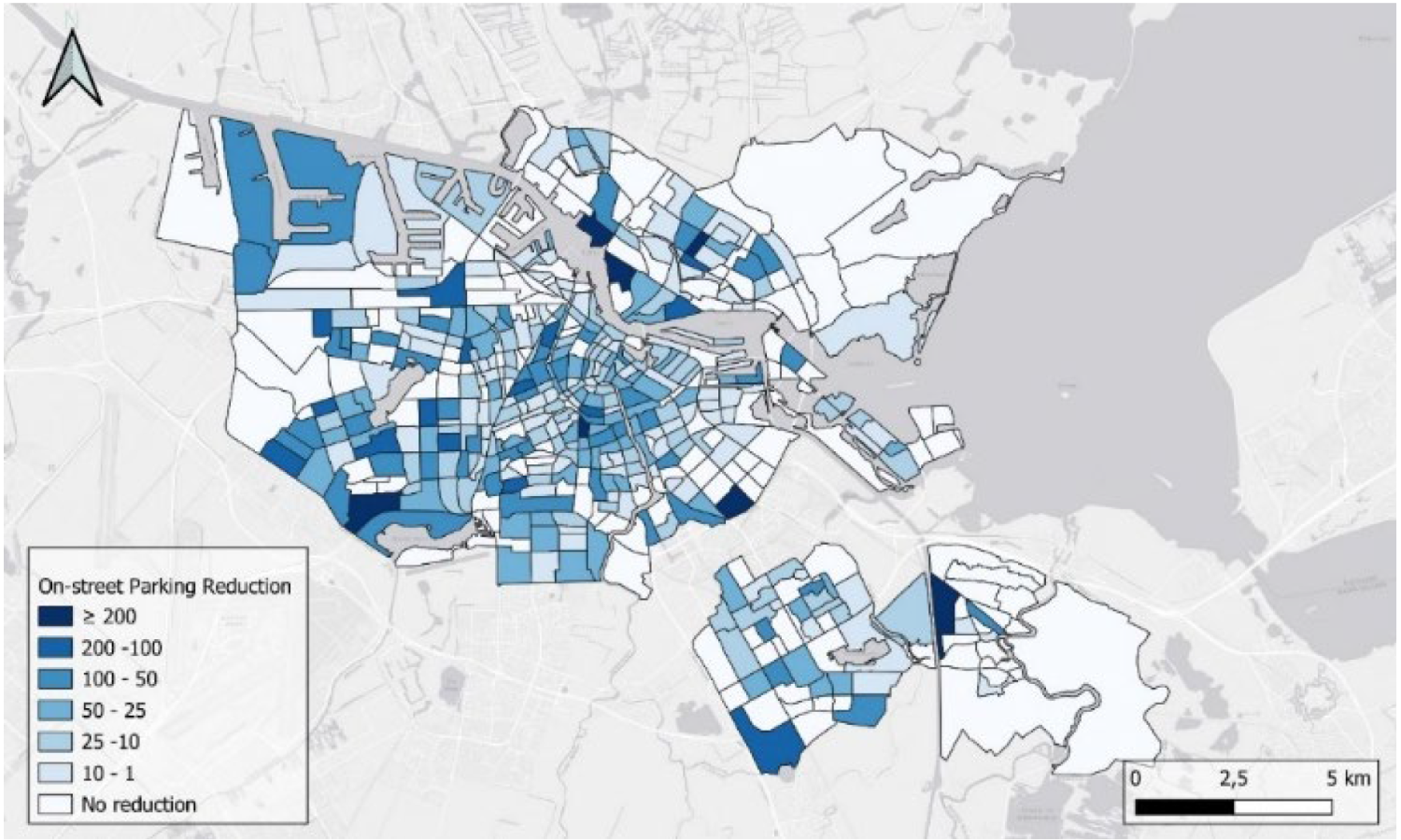 On-street parking space reduction in Amsterdam between 2017 and 2024