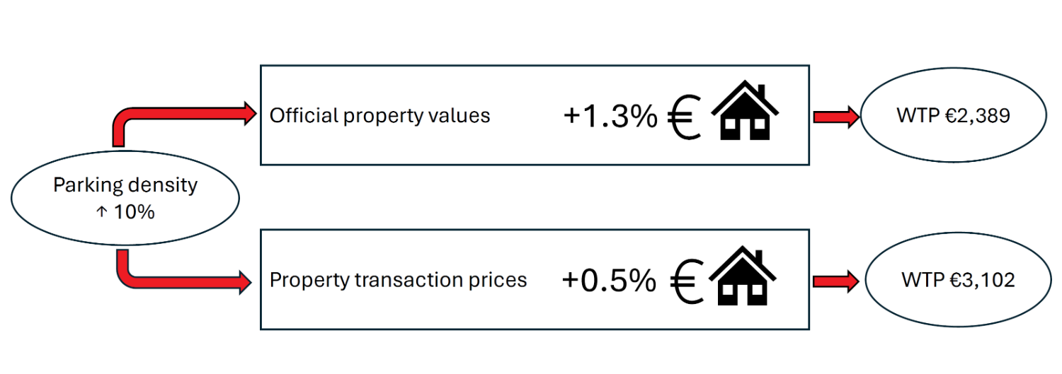 Amsterdam residents place a positive value on on-street parking with a willingness to pay (WTP) €2,389 and €3,102 for the availability of on-street parking within the 200-500 m buffer zone near their property.